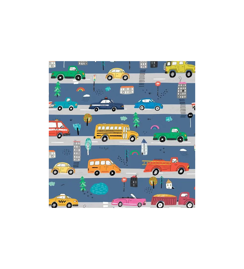 El estampado inspirado en paisajes urbanos con fondo azul está lleno de detalles dinámicos y vibrantes que capturan el movimiento y la energía del día. Perfecto para niños curiosos y aventureros que disfrutan explorando entornos urbanos e imaginando metrópolis bulliciosas.