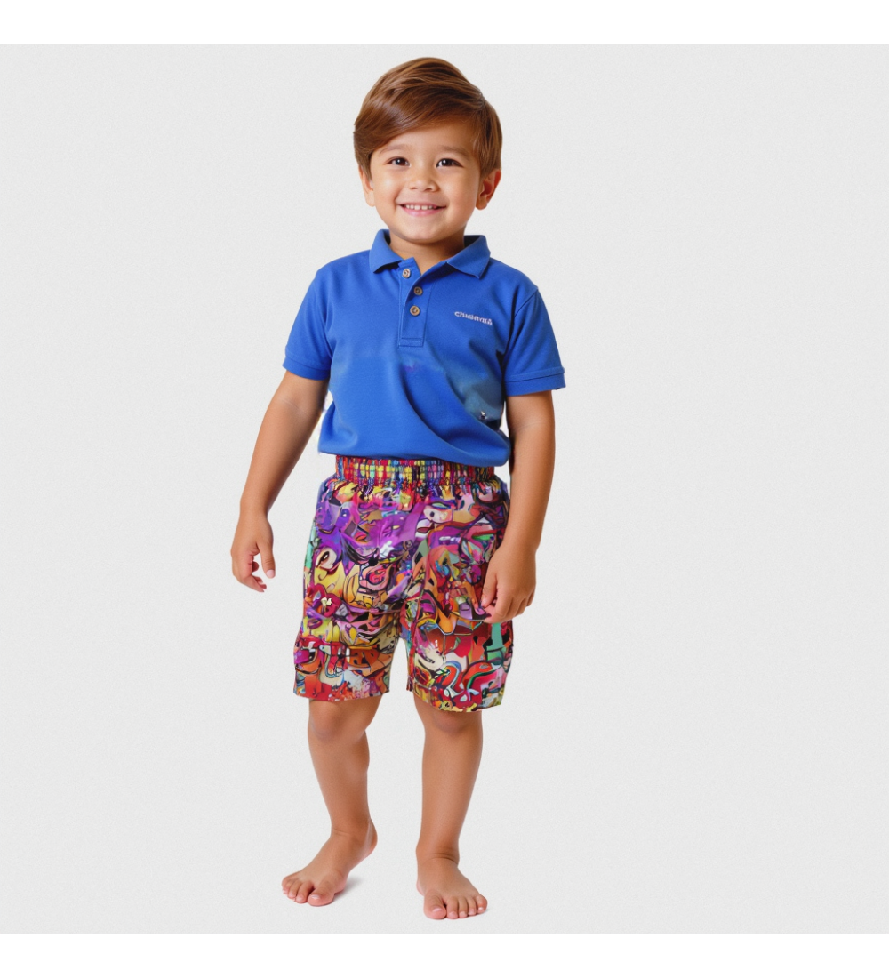 Discover the GRAFFITI swim shorts for boys—a bold, urban-inspired piece designed for kids who love to stand out. Featuring a vibrant, multicolored graffiti print reminiscent of city street art, these swim shorts add a playful and energetic vibe to any summer look. Made from lightweight, quick-drying materials, they guarantee comfort and total freedom of movement for endless fun at the pool, beach, or any sunny adventure. Style them with basic cotton t-shirts and sandals for a laid-back, casual outfit, perfect for relaxed days by the water. For a more modern and trendy touch, pair them with a linen shirt and sporty sneakers—ideal for boys who want to express their creativity and individuality. The GRAFFITI swim shorts are the ultimate choice for boys with personality, offering versatile looks that go from playful to effortlessly cool, always ensuring style and comfort.